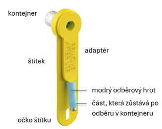 - 7. Adaptér v tuto chvíli obsahuje již nepotřebnou část modrého odběrového hrotu. Tahem za adaptér tuto část sejmete ze štítku s kontejnerem (obr. 3 – krok 2). Pro ověření úspěšného odběru si můžete zkontrolovat přítomnost modré membrány uvnitř kontejneru.